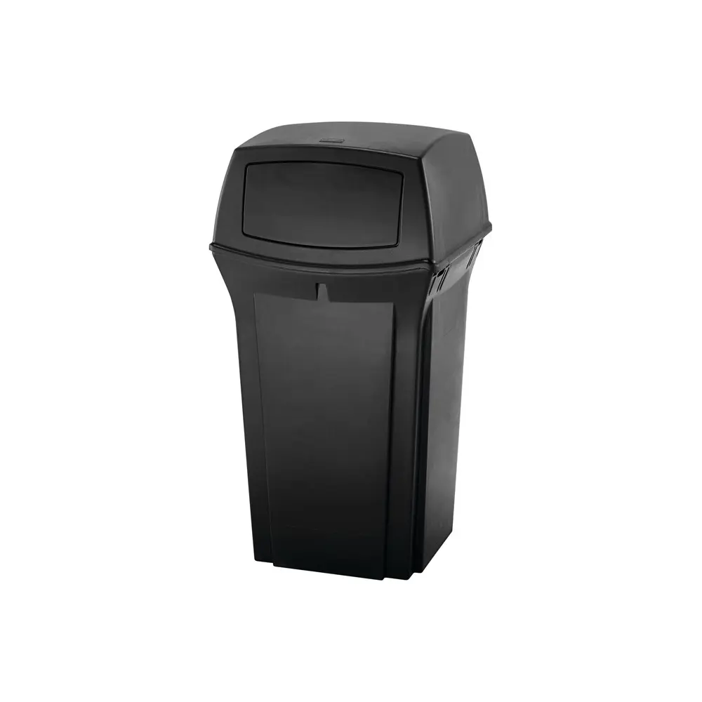 Der Rubbermaid Ranger Abfallbehälter mit einem großen Fassungsvermögen von 132 Litern eignet sich besonders für stark frequentierte Bereiche wie Stadien, Parks oder Einkaufszentren. Die 2 großen Einwurfklappen nehmen problemlos größere Abfallstücke auf, verbergen aber zeitgleich den Inhalt und halten Gerüche zurück. Der Klappdeckel ist mit innen liegenden, langlebigen Scharnieren am Behälter befestigt, damit der Deckel bei der Entleerung sicher am Behälter bleibt. Eine praktische Metallhalterung sichert den eingehängten Abfallsack.Eigenschaften Rubbermaid Ranger Abfallbehälter mit 2 Einwurfklappen