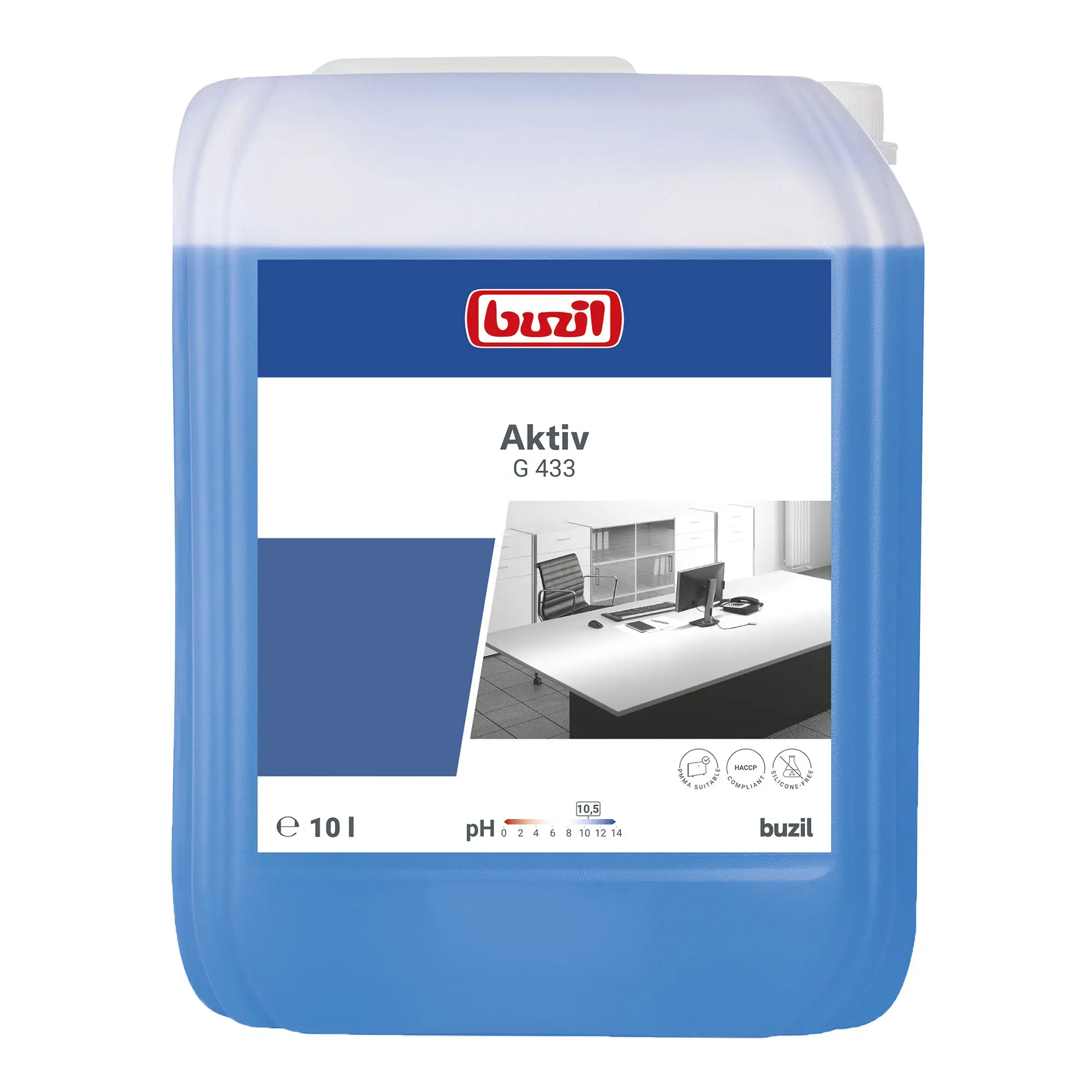 Der materialschonende Allzweckreiniger Buzil Aktiv G433 überzeugt durch eine hervorragende Reinigungswirkung selbst bei starken Verschmutzungen. Mit seinem hohen Dispergiervermögen entfernt er zuverlässig Staub, Fett- und Ölablagerungen und sorgt für streifenfreie Sauberkeit. Dabei bleibt er besonders schonend zu Oberflächen und Materialien. Dank seiner hohen Wirtschaftlichkeit durch sparsame Dosierung ist der Allzweckreiniger besonders ergiebig. Zudem erfüllt er die Anforderungen im Rahmen eines HACCP-Konzepts und ist damit ideal für den Einsatz in hygienisch sensiblen Bereichen geeignet. Der Buzil Aktiv G433 kann sowohl manuell als auch im Reinigungsautomaten angewendet werden und ist für alle wasserbeständigen Oberflächen wie Türen, Fensterrahmen, Heizkörper sowie Kunststoff- und Glasflächen geeignet. Auch Stein- und Kunststoffböden werden zuverlässig gereinigt. Selbst für Acrylglas (PMMA) ist dieser Reiniger bestens geeignet und bietet so vielseitige Einsatzmöglichkeiten.
