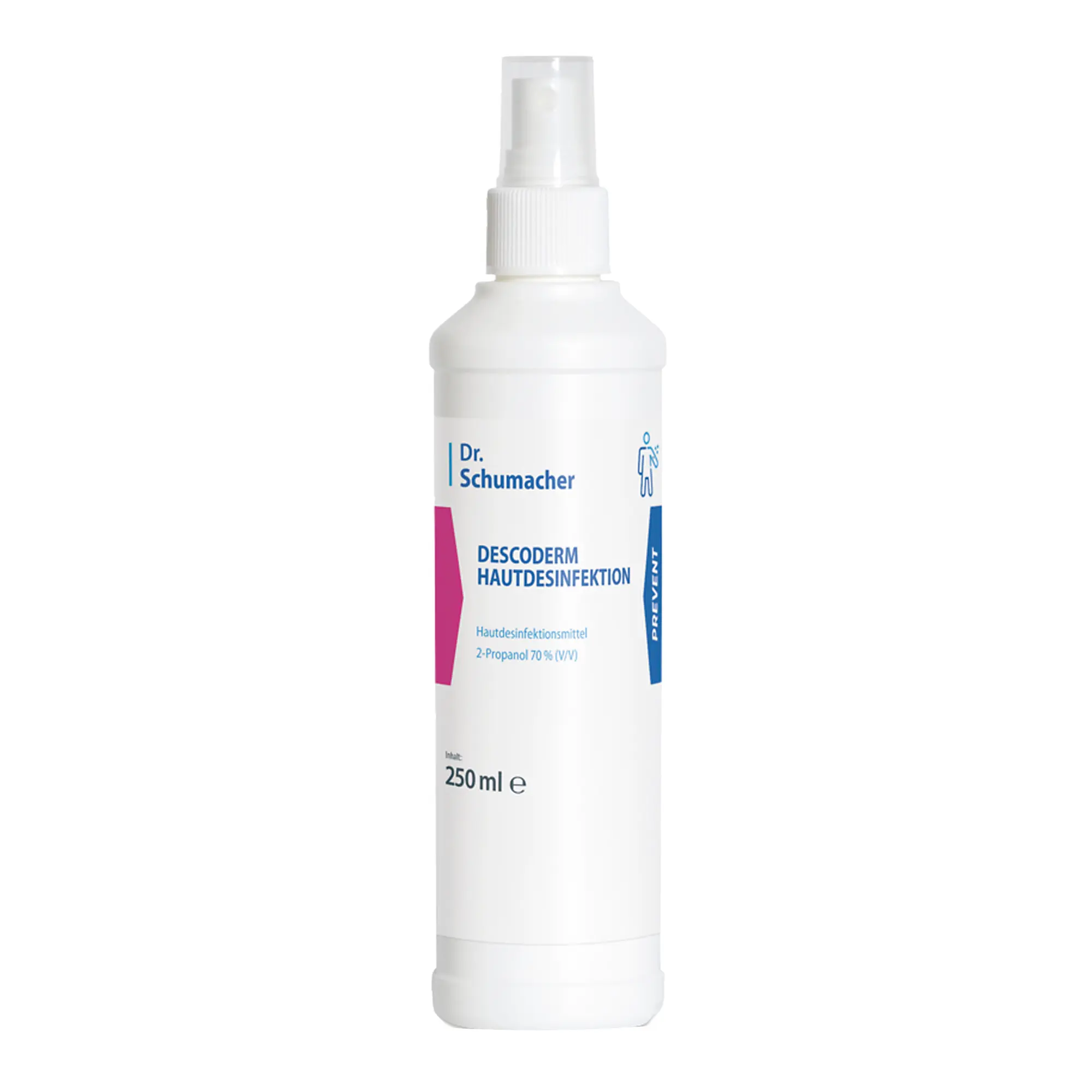 Dr. Schumacher Descoderm ist ein alkoholisches und besonders hautverträgliches Hände- und Hautdesinfektionsmittel, das sich besonders für haut- oder allergieempfindliche Personen empfiehlt. Es enthält keine kumulierenden Langzeitwirkstoffe, Parfüm oder sonstige Zusatzstoffe, die empfindliche Haut reizen könnten. Es wirkt bakterizid, tuberkulozid, levurozid und virusinaktivierend. Es ist aufgenommen in die aktuelle Desinfektionsmittelliste der DGHM/VAH, eingetragen in die Desinfektionsmittelliste des RKI.