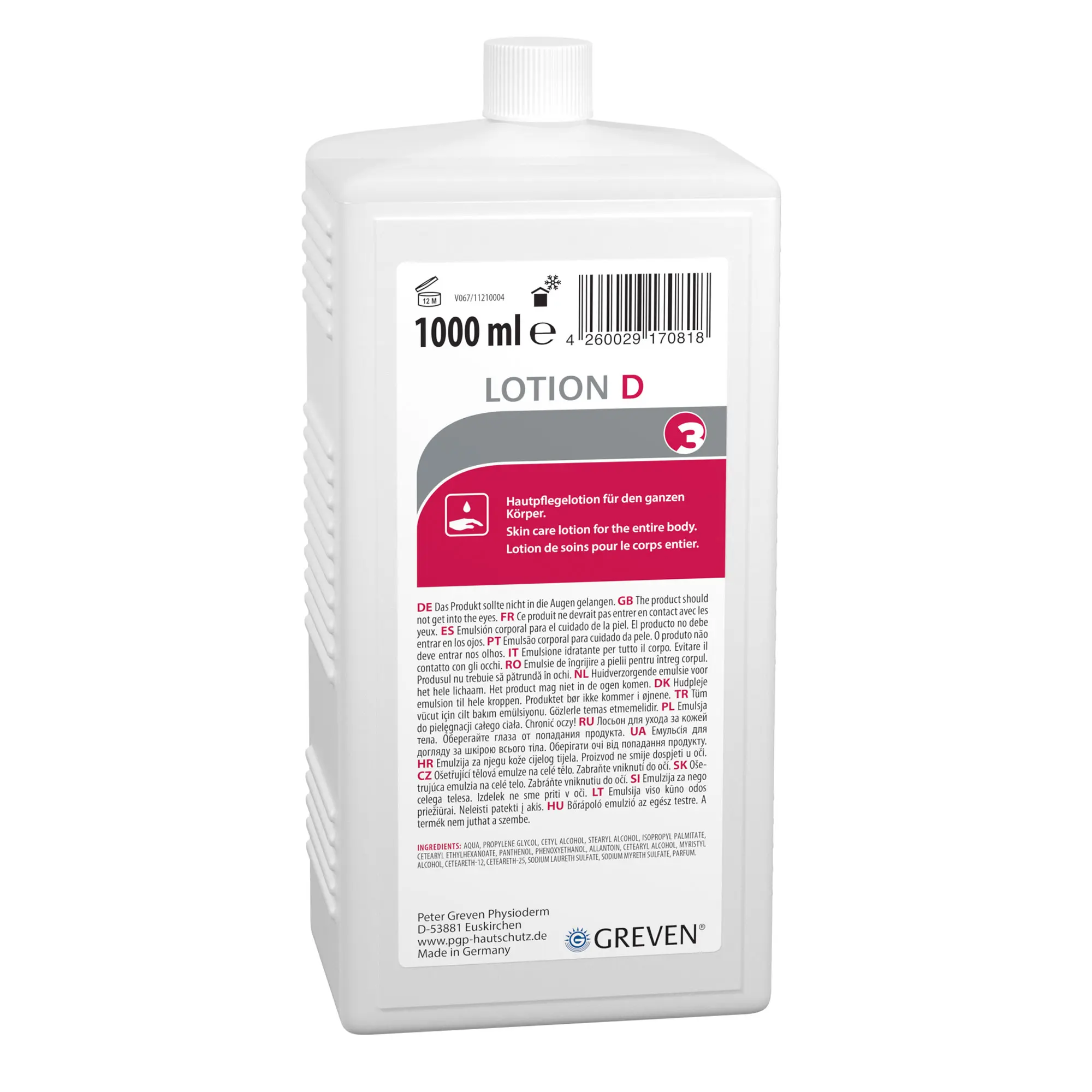 Speziallotion D basiert auf einer Öl-in-Wasser-Emulsion und wurde speziell für die Pflege beruflich beanspruchter Haut entwickelt. Sie ist mittelstark fettend, zieht leicht in die Haut ein und hinterlässt keinen störenden Fettfilm. Das Produkt ist frei von Silikonen.