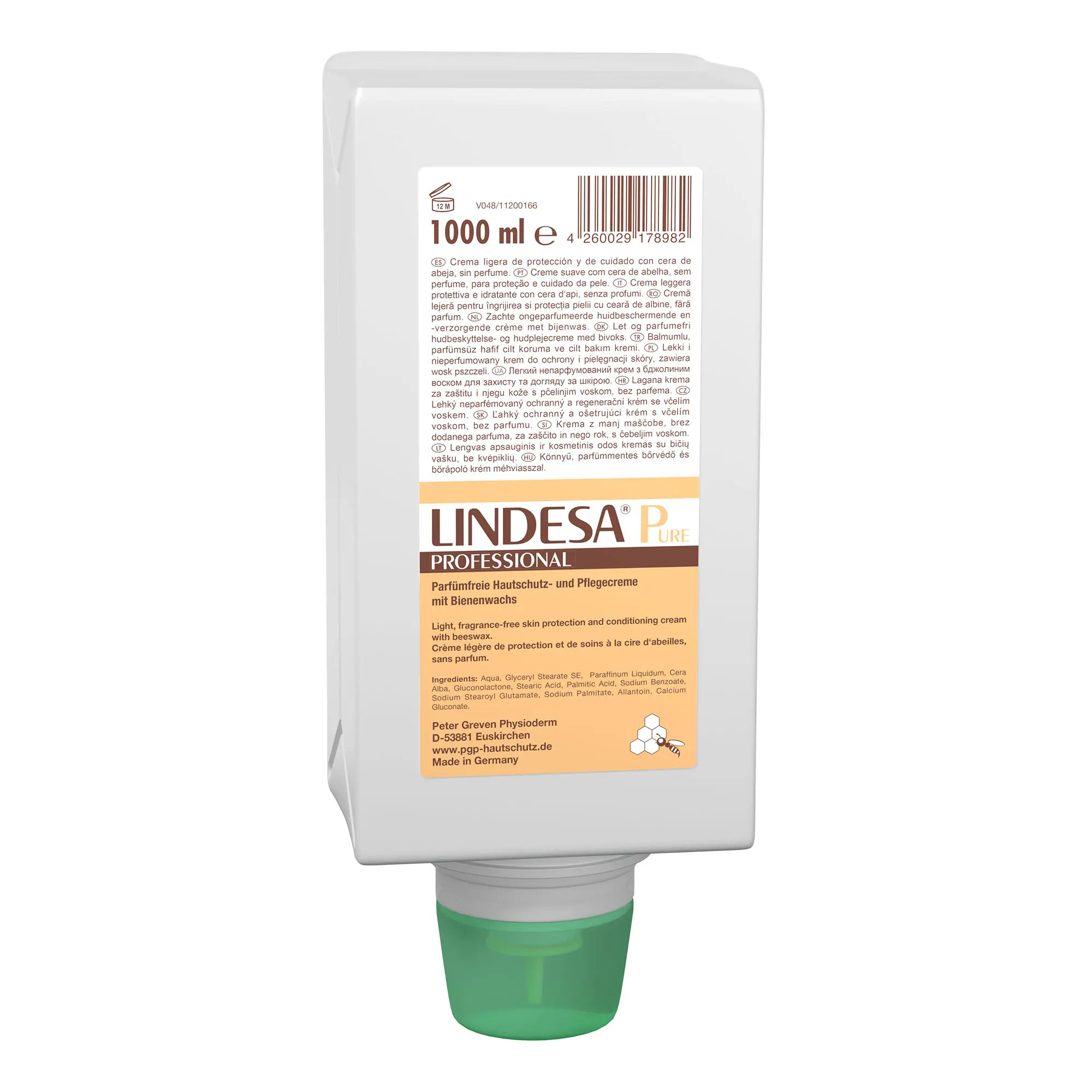 Lindesa Pure Professional ist eine parfümfreie, silikonfreie Hautschutzcreme mit Bienenwachs vom Typ O/W (Öl in Wasser). Sie eignet sich ideal zur Pflege empfindlicher Haut. Lindesa Pure Professional zieht schnell ein und stärkt die Abwehrfunktion der Haut. Sie beugt Hautschädigungen durch äußere Belastungen vor und wirkt normalisierend auf gereizte Hautpartien. Diese unparfümierte Hautpflegecreme glättet und pflegt die Haut, ohne nachhaltig zu fetten. Ihre Rezeptur ist besonders schonend dank eines modifiziertem Konservierungssystems. Lindesa Pure Professional Creme ist eine Schutz- und Pflegecreme mit breitem Anwendungsspektrum. Bei eher geringen Belastungen bietet sie Schutz gegen schwache Säuren, Alkalien und organische Substanzen. Lindesa Pure Professional eignet sich ebenfalls hervorragend als Pflegecreme zur täglichen Anwendung, auch bei beanspruchter Haut.
