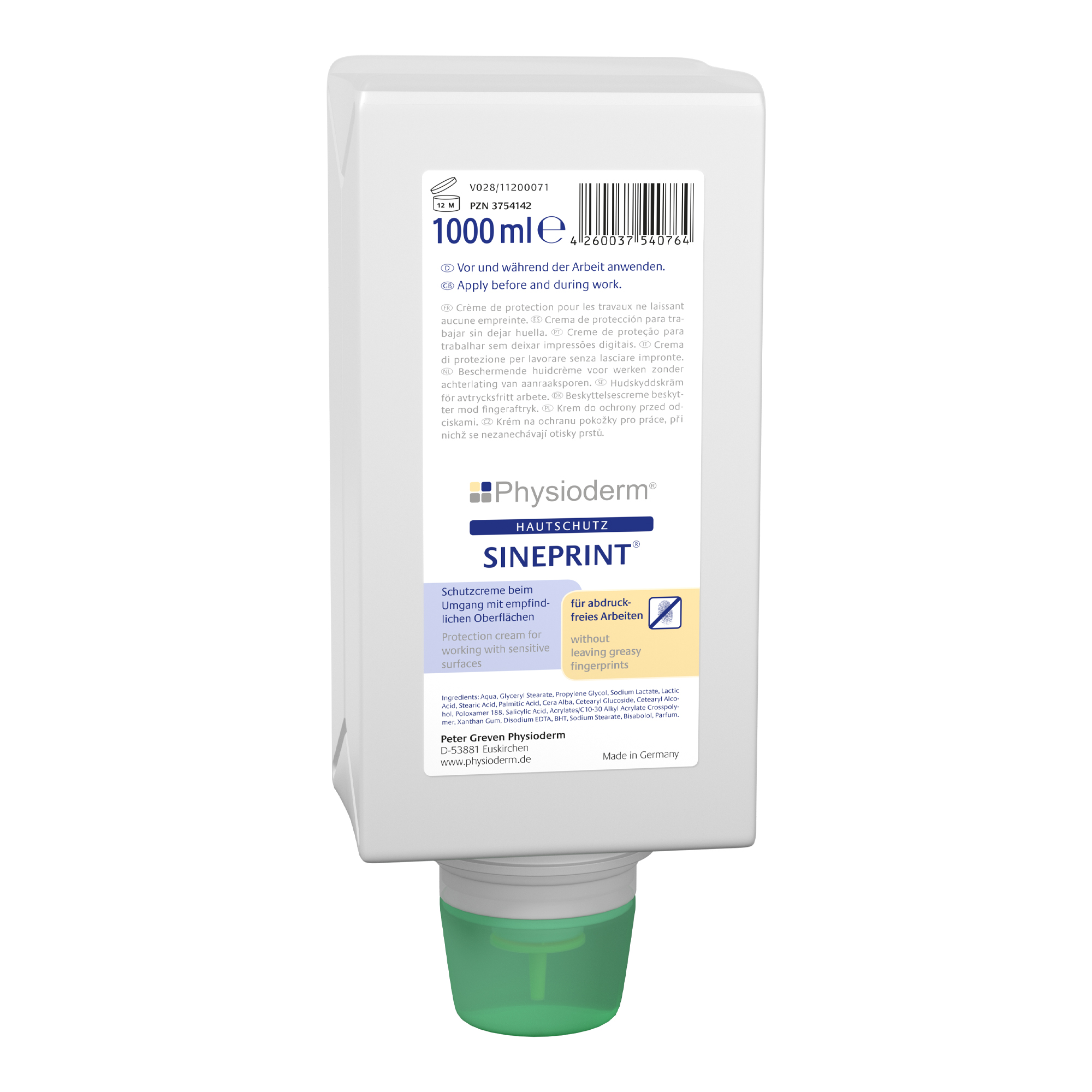Physioderm sineprint schützt empfindliche Werkstücke vor Fettabdrücken durch den Bearbeiter und die Haut beim Umgang mit mechanisch reizenden Arbeitsstoffen wie z. B. Staub, Metallabrieb, Glasfaserstäuben und Papier. sineprint® Hautschutzcreme enthält natürliche Wachsteilchen, die in der fett- und silikonfreien Grundlage gelöst sind. Nach dem Auftragen auf die Haut bilden die Wachsteilchen - zusammen mit anderen Inhaltsstoffen - einen stabilen, luftdurchlässigen Schutzfilm auf der Haut. Der entstandene Schutzfilm verhindert den direkten Kontakt der Haut mit mechanisch reizenden Arbeitsstoffen. Die Griffigkeit und Rutschfestigkeit der Hände wird erheblich verbessert. Die natürlichen, physiologischen Funktionen der Haut werden durch den Schutzfilm nicht beeinträchtigt.