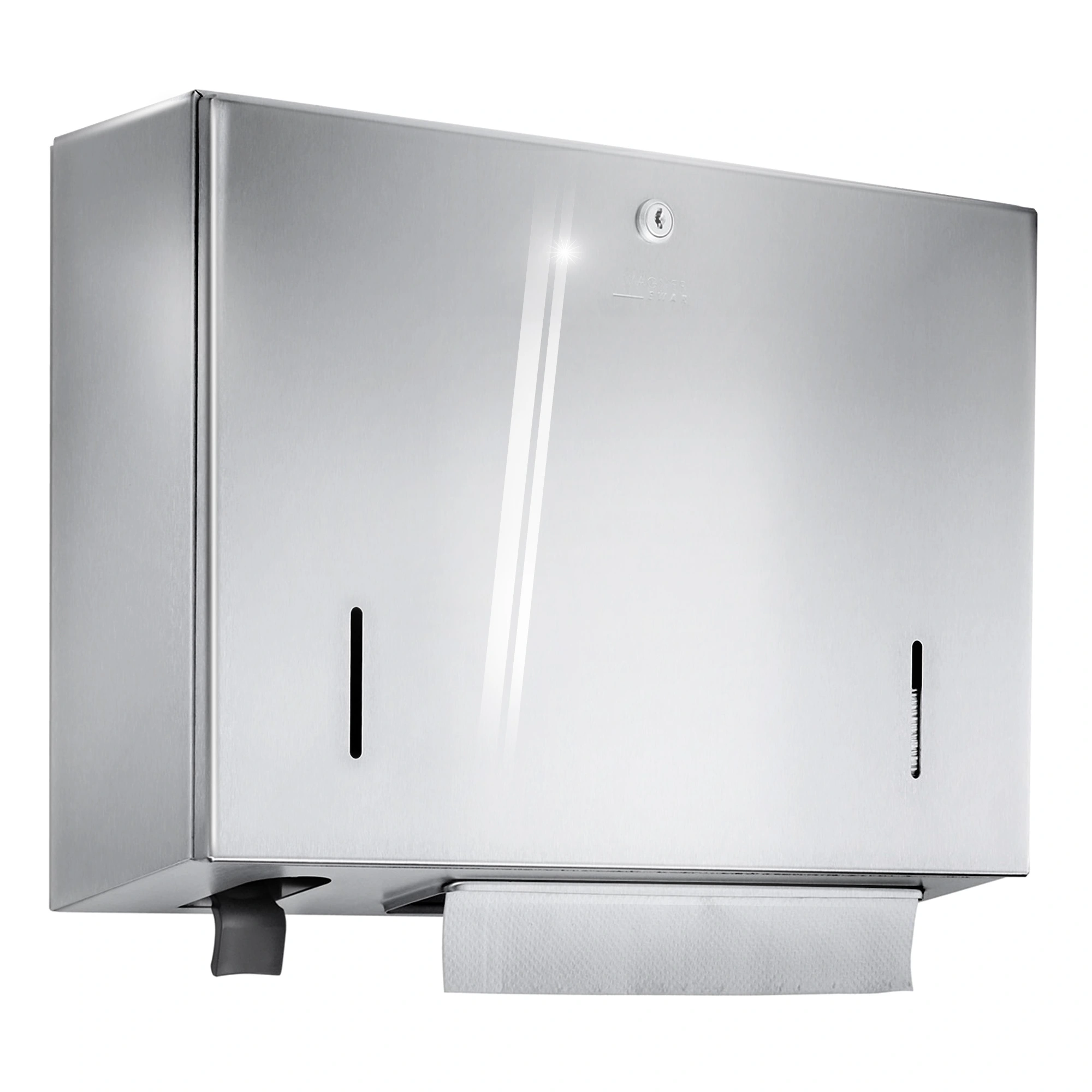 Wagner EWAR WP 550-5 Spenderkombination aus Handtuchspender und Schaumseifenspender in einem Gehäuse. Das robuste Ganzedelstahlgehäuse ist an allen Ecken voll verschweißt, wirkt keimreduzierend und ist sehr einfach zu reinigen. Der Schaumseifenspender ist geeignet für handelsübliche Einweg-Flaschen mit Schaumseifenkonzentrat. In den Handtuchspender passen ca. 500 handelsübliche Papierhandtücher mit Zickzack-Falzung. Über die zwei Sichtfenster kann schnell kontrolliert werden, ob ein Spender wieder aufgefüllt werden muss. Die Abdeckung ist abschließbar. Dank einer stabilen Wandmontage ist der Spender diebstahlsicher. Lieferung einschließlich Befestigungsmaterial, Erstbefüllung Schaumseifenkonzentrat und einem Päckchen Papierhandtücher.Eigenschaften Wagner EWAR WP 550-5 Kombination aus Handtuchspender und Schaumseifenspender