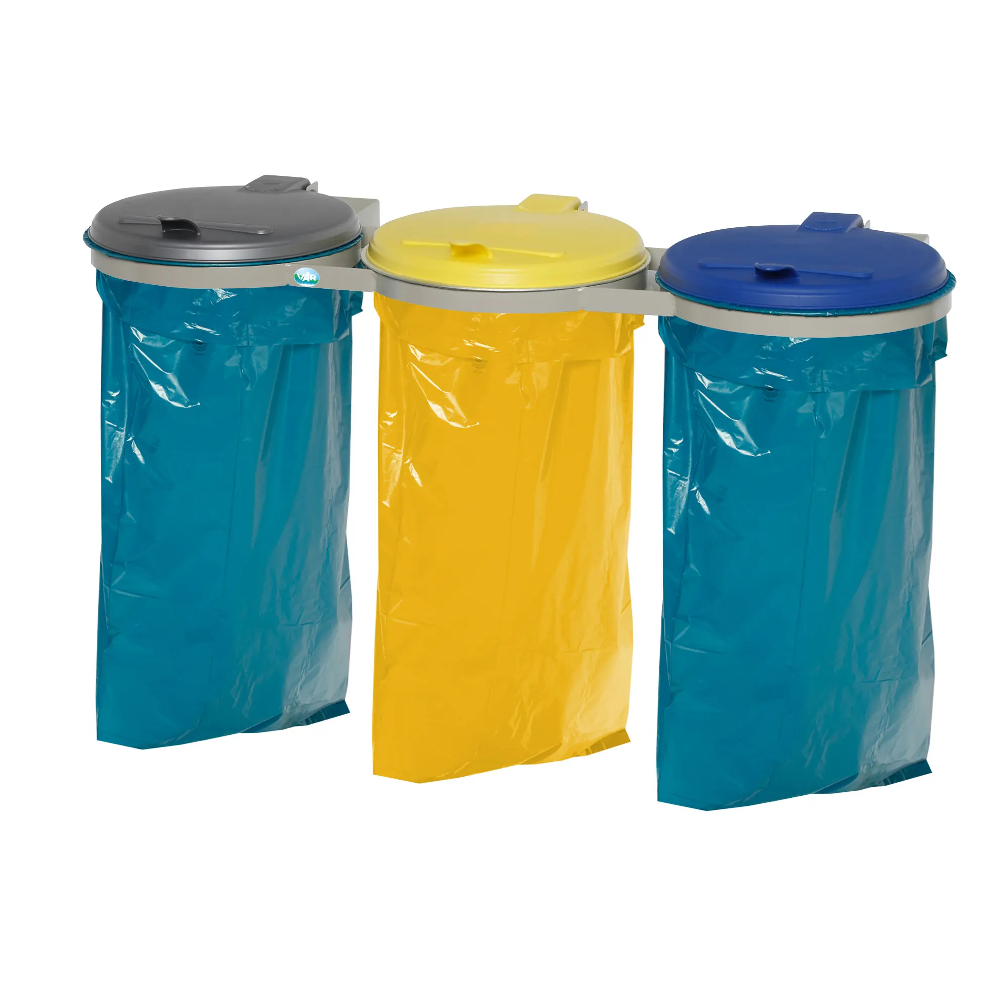 Diese 3-teilige Mülltrennstation zur Wandmontage besteht aus drei Abfallsackhaltern mit Kunststoffdeckeln in Gelb, Blau und Silber. Das Gestell aus robustem, pulverbeschichteten Stahl in Kieselgrau (ähnlich RAL 7032) sorgt für einen sicheren Halt. Ein stabiler Klemmring fixiert die Müllbeutel mit bis zu 120 Liter Fassungsvermögen rutschfest und zuverlässig.Eigenschaften VAR Abfallsackhalter WS 120