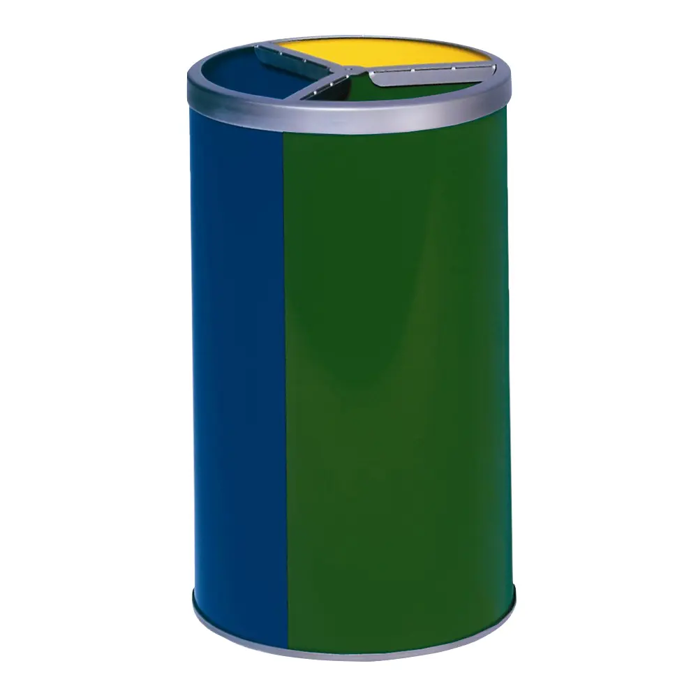 Diese praktische Mülltrennstation aus hochwertigem Stahl besteht aus drei einzelnen Behälter-Segmenten. Die Eimer werden durch ein Bodenteil und ein ringförmiges Kopfteil zusammengehalten. So ergibt sich eine formschöne, kreisförmige Recyclingstation mit drei Einwurföffnungen. Sie lässt sich blitzschnell und unkompliziert auseinanderbauen und wieder zusammenstellen. Bestückt werden die einzelnen Eimer mit 60 Liter-Abfallsäcken, welche durch das Kopfteil im oberen Bereich sicher und fest fixiert werden können. Ein Behälter fasst jeweils 30 Liter Müll. Sie erhalten die Station entweder in einer Ausführung aus glänzend poliertem Edelstahl, mit anthrazit (RAL 7021) beschichtetem Boden und Kopfteil. Alternativ gibt es diese Mülltrennstation auch mehrfarbig, hergestellt aus pulverbeschichtetem Stahlblech. Boden und Kopfteil sind in diesem Fall immer silberfarben beschichtet.Eigenschaften VAR Wertstoffstation 3-fach