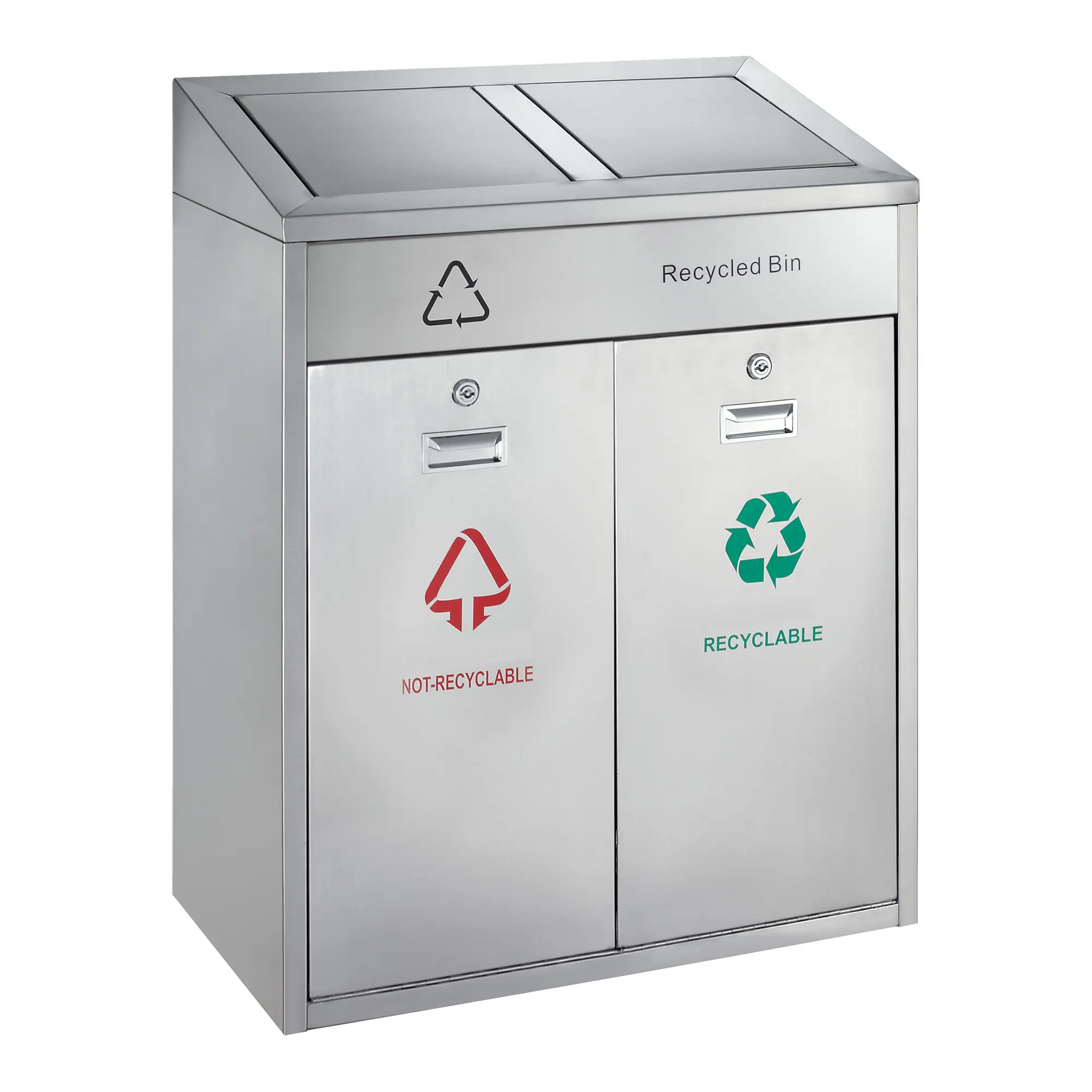 Diese wetterfeste Outdoor-Mülltrennstation verfügt über zwei große Einwurfklappen, eingelassen im abgeschrägten Deckelbereich. Das Gehäuse besteht aus mattem Edelstahl, der mit einer Anti-Fingerabdruckbeschichtung versehen ist. Der Abfallbehälter bleibt so lange sauber und ist auch leicht zu reinigen. Die Abfälle werden in robusten Kunststoffinneneimern zu jeweils 21 Litern Fassungsvermögen aufgefangen. Die abschließbaren Fronttüren ermöglichen eine unkomplizierten Zugang zu den Inneneimern und sichern diese zuverlässig gegen Vandalismus.Einsatzbereiche Recycling Abfalleimer 2x21 Liter