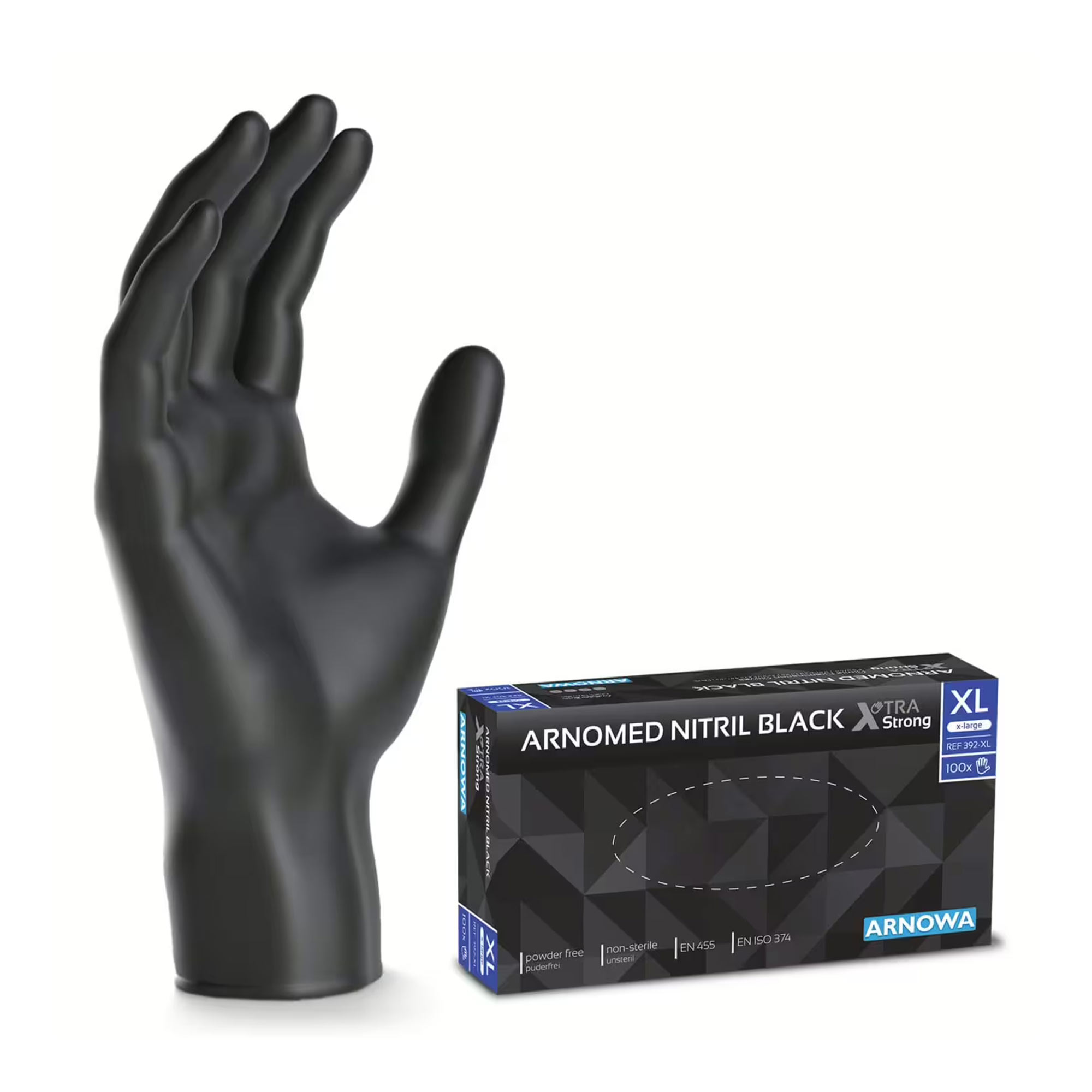ARNOMED XTRA STRONG NITRIL BLACK Untersuchungshandschuhe werden für den zuverlässigen Schutz bei medizinischen, hygienischen und handwerklichen Tätigkeiten verwendet. Die puderfreien Einmalhandschuhe aus robustem Nitril überzeugen durch ihre extra starke Materialqualität und hohe Elastizität, wodurch sie besonders reißfest und langlebig sind. Dank der fingertexturierten Oberfläche bieten sie auch bei feuchten oder öligen Bedingungen eine sehr gute Griffigkeit und präzises Arbeiten. Die schwarze Farbe sorgt für ein professionelles Erscheinungsbild und eignet sich ideal für sensible Einsatzbereiche wie Medizin und Labor, Pflege, Kosmetik- und Tattoo-Studios sowie die Lebensmittelindustrie. Durch die beidhändige Tragbarkeit und den praktischen Rollrand an der Stulpe lassen sich die Handschuhe schnell und sicher an- und ausziehen.