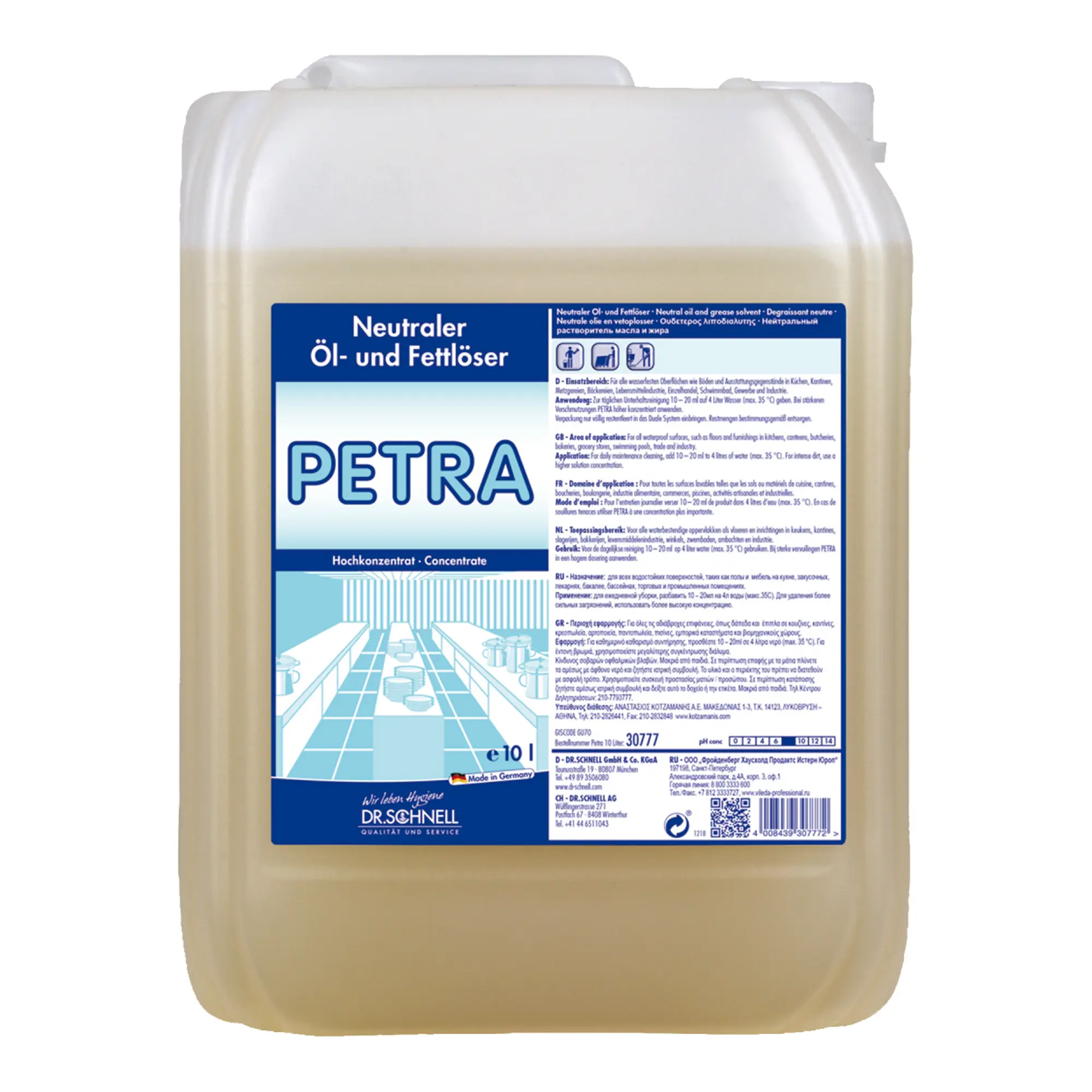 Dr. Schnell Petra ist ein neutraler Öl- und Fettlöser mit hervorragender Schmutzlöseeigenschaften. Dr. Schnell Petra ist im gesamten Lebensmittel verarbeitenden Bereich, im Schwimmbadbereich sowie in Gewerbe und Industrie einsetzbar. Der geruchsneutrale und gut hautverträgliche Fettlöser löst mühelos alle abwaschbaren Oberflächen und Fußböden.
