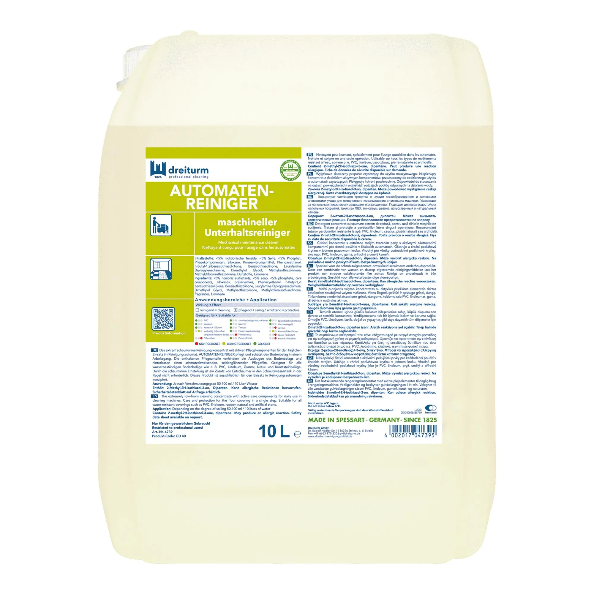 Der AUTOMATENREINIGER von Dreiturm wurde für den täglichen Einsatz bei der maschinellen Unterhaltsreinigung in Reinigungsautomaten entwickelt. Er ist extrem schaumarm, so dass der zusätzliche Einsatz von Entschäumungsmitteln im Schmutzwassertank in den meisten Fällen unnötig ist. Viele wasserbeständige Bodenbeläge, u. a. PVC, Linoleum oder Natur- und Kunststeinböden, können damit zuverlässig von Schmutz befreit werden. Die Wirkstoffformel des Dreiturm AUTOMATENREINIGER wurde durch Pflegekomponenten ergänzt, die die Bodenbeläge schon beim Reinigungsvorgang in einem Arbeitsgang pflegen. Die pflegenden Zusatzstoffe schützen die Böden vor dem Auslaugen und sorgen für einen schmutzabweisenden Pflegefilm mit leichtem Seidenglanz. Die Bodenbeläge bleiben länger schön und ansehnlich und werden vor starker Abnutzung geschützt, und das alles in nur einem zeitsparenden Arbeitsgang zusammen mit der Reinigung.
