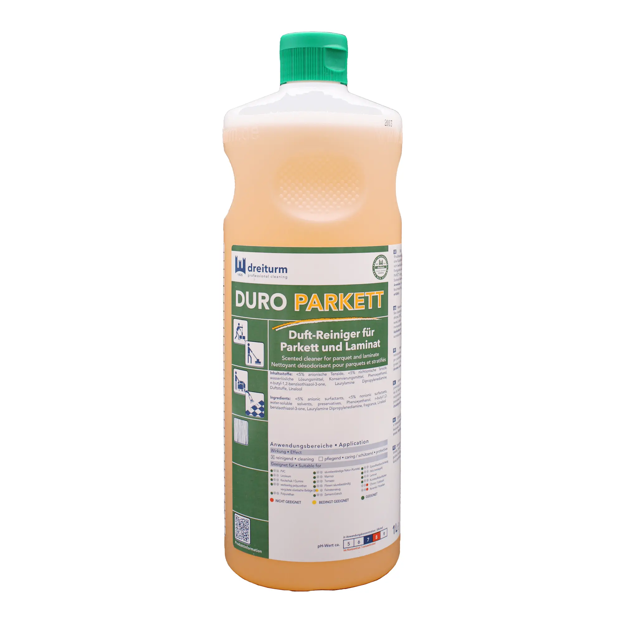DURO PARKETT von Dreiturm ist ein schonender Reiniger, der sowohl Material als auch Haut schont und keine rückfettenden oder filmaufbauenden Substanzen enthält. Er eignet sich perfekt für die laufende Unterhaltsreinigung mittels Feuchtwisch- oder Sprühverfahren. Mit seiner optimalen Reinigungswirkung trocknet er schnell und hinterlässt keine Schlieren oder Streifen. Dabei beeinflusst er den Glanz von Laminat und Parkett nicht. Ob es sich um Laminatböden, Fertigparkett oder versiegelte, beschichtete, imprägnierte und geölte Holzböden handelt, DURO PARKETT ist die ideale Wahl für eine gründliche und materialschonende Reinigung.