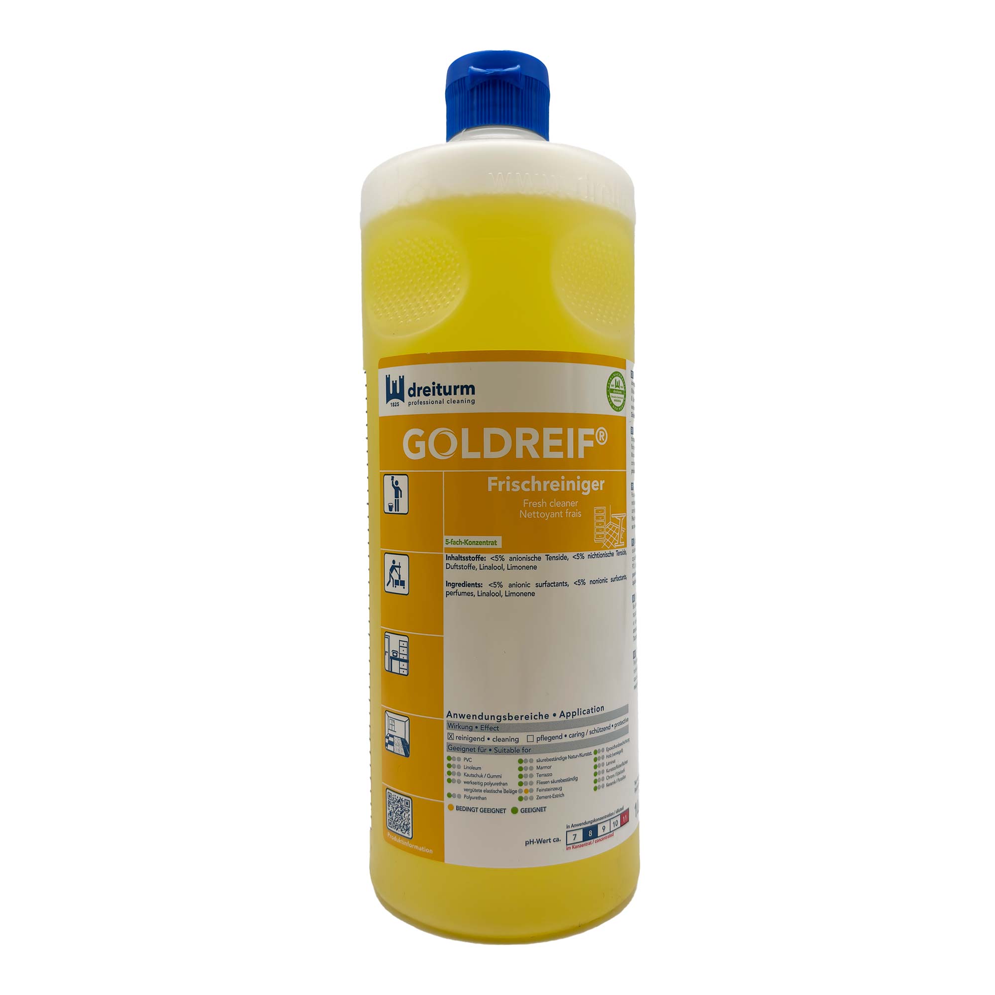 Dreiturm GOLDREIF Frischreiniger ist ein hochwertiges Universalreinigerkonzentrat für abwaschbare Oberflächen. Ideal für wasserfeste Böden wie Naturstein, Kunststein, Fliesen, PVC, Gummi und Linoleum. Salmiakfrei und CLP-kennzeichnungsfrei, erfüllt er höchste Umweltstandards. Vegan und ohne schädliche Chemikalien bietet er effektive Reinigung und eine umweltbewusste Lösung.