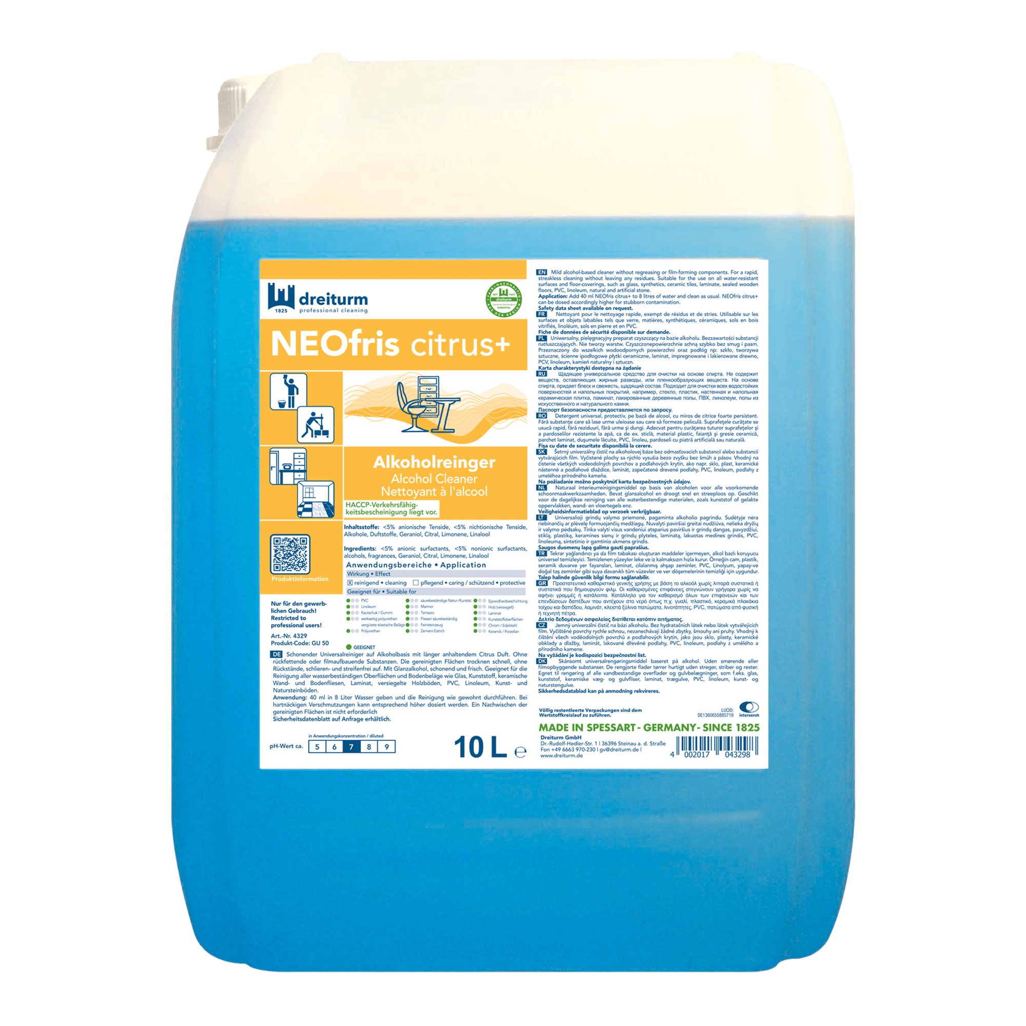 Der NEOfris citrus+ Alkoholreiniger von Dreiturm überzeugt mit seiner Reinigungswirkung und dem langanhaltenden Duft von frischer Zitrusfrucht. Er enthält keine rückfettenden oder filmaufbauenden Substanzen. Die gereinigten Flächen trocknen schnell und hinterlassen keinerlei Rückstände, Schlieren oder Streifen. Dank des enthaltenen Glanzalkohols erstrahlen die Oberflächen in einem schonenden und frischen Glanz. Der Reiniger ist optimal geeignet für die Reinigung aller wasserbeständigen Oberflächen und Bodenbeläge, darunter Glas, Kunststoff, keramische Wand- und Bodenfliesen, Laminat, versiegelte Holzböden, PVC, Linoleum sowie Kunst- und Natursteinböden. Darüber hinaus liegt eine HACCP-Verkehrsfähigkeitsbescheinigung vor.