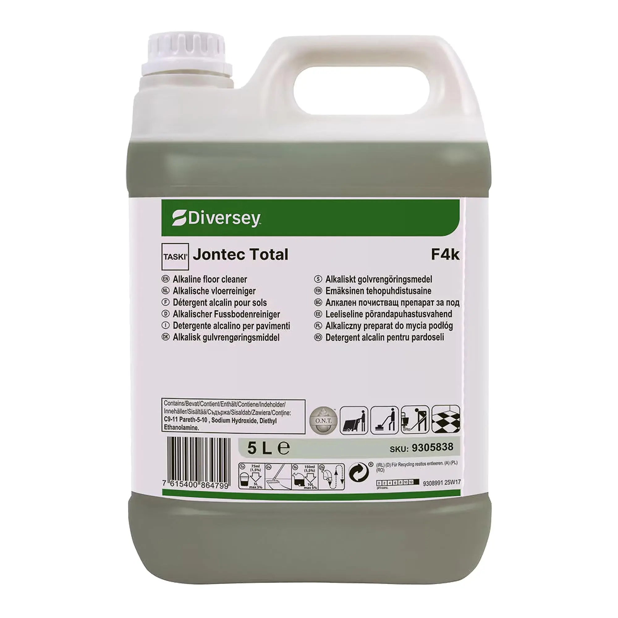 TASKI Jontec Total ist ein hochalkalischer Fußbodenreiniger auf Tensidbasis für alle wasserfesten, unbeschichteten Böden. Der Fett- und Fleckenentferner hat ein gutes Emulgiervermögen, wodurch er hervorragende Reinigungsergebnisse erzielt. Jontec Total ist als Unterhaltsreiniger anwendbar auf Böden und anderen Flächen und hinterlässt einen angenehmen, frischen Duft.Einsatzbereiche TASKI Jontec Total F4k Fußboden- und Oberflächenreiniger