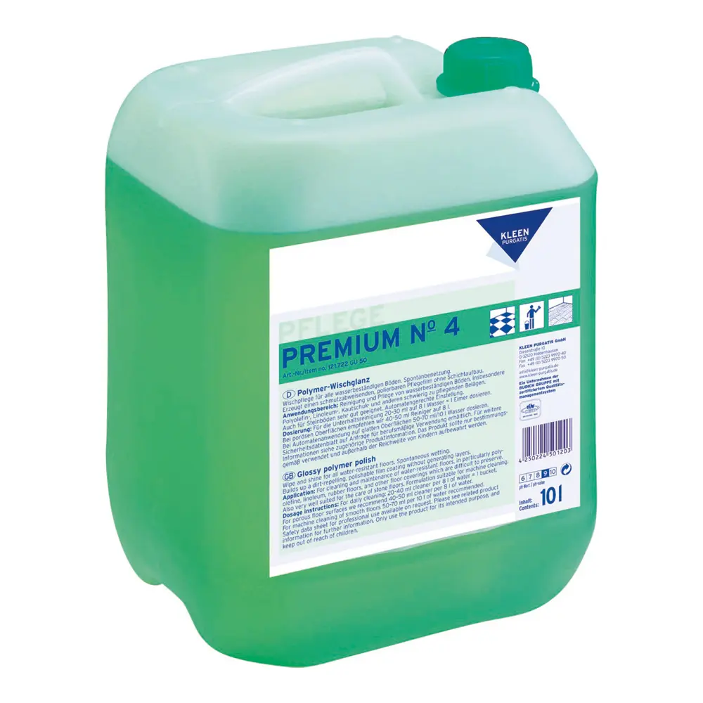 Kleen Purgatis Premium No 4 ist eine hochkonzentrierte, neutrale Polymer-Wischpflege für die Unterhaltsreinigung aller Hartbeläge. Premium No 4 hat hervorragende Benetzungseigenschaften und beschleunigt so die Reinigung. Innovative Pflegesubstanzen bilden einen schützenden und schmutzabweisenden Film, bauen aber keine Schichten auf.